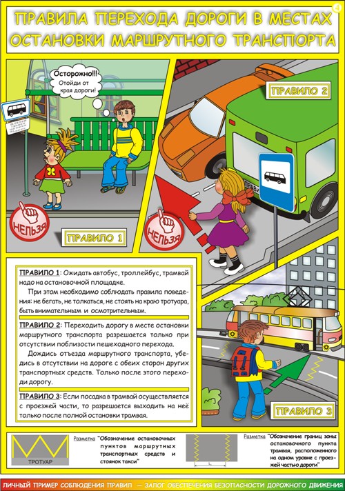 • При выходе из автобуса на нужной остановке, следует обходить его сзади, перед этим убедившись, что за ним не едет другой транспорт.• Выходя, из трамвая, можно дождаться пока он отъедет от остановки. Если ожидать нет времени, можно обойти его спереди, предварительно посмотрев, нет ли другого трамвая, двигающегося навстречу первому.
